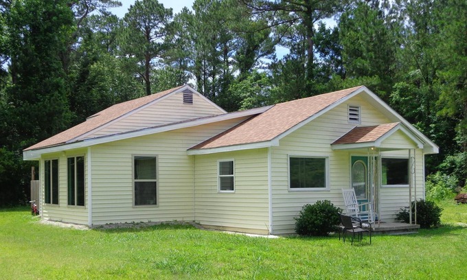 This home has two bedrooms, a loft, living room, sunroom, shower, large kitchen, dining area, and a fire pit in the back. Plenty of parking near the entrance--spacious grounds -large deck for sitting-sunbathing or cooking at the rear of the home with a privacy fence. Bring your boat! You will have free access to a private boat ramp, fishing pier, and fish cleaning station. There is DirecTV and Wi-Fi. Close to Historic Beaufort, Havelock, Cherry Point, Newport, Morehead City, and Atlantic Beach.