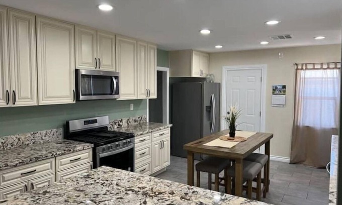 This house is a great place to book if you are a party of 7 people. There are 2 (two) bedrooms with Queen size beds in each room with an additional roll out bed in the room if needed! In the living room there’s a queen size sofa bed. In the bedrooms each doors have code locks to enter or lock door. In the living room you will also find a 45" Smart TV with Netflix. We do provide free Wifi! This entire house is fully equipped with everything you and your family or guests will possibly need during your stay. All required amenties such as pots and pans, silverware, blender, toaster, and etc. you will find in your brand new kitchen with brand new appliances. In the backyard there is propane BBQ grill, fire pit, and patio chairs to relax.