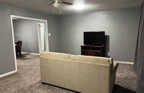 You'll be close to everything in Brownfield when you stay at this centrally-located house. Three bedrooms, one bath. Each room has its own closet,dresser and hardwood floors. The master bedroom has a King Sized bed. The middle room has bunkbeds. And the third bedroom has twin beds with XL length mattresses which are about 4 inches longer than regular twin mattresses. Just a few blocks from the High School and the football stadium.