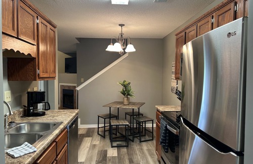 Have fun with the whole family at this stylish place. This one is equipped with space for everyone! Living room with fireplace, cute eat in kitchen area! Tall vaulted ceilings. 2 Bedrooms down 1 Queen size bed and 1 Full size bed with 2 full bathrooms and 1 bedroom with Full size bed and 1 full bathroom upstairs. Backyard is fully fenced for your enjoyment and privacy. Two of the Three bedroom’s have private bathrooms.