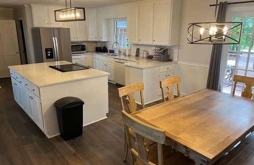 Five spacious bedrooms including 1 King and 4 Queen beds. All bedrooms include smart tv's, room darkening curtains, and the Queen bedrooms include custom luggage racks. There are 3.5 bathrooms. The master has an ensuite bathroom with two sinks and a walk in shower. There is a hall bathroom with a full bath tub and the 3rd bathroom has a large walk in shower. The large half bath is shared with the laundry room.