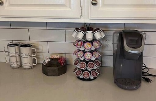 This well stocked kitchen has everything you need to cook family meals including pots and pans, casserole dishes, crock pot and a mixer. The kitchen also comes fully stocked with a selection of Keurig coffee and tea as well as sugars and creamers. Although coffee is not provided, there is also a regular coffee pot for brewing a large pot of coffee.