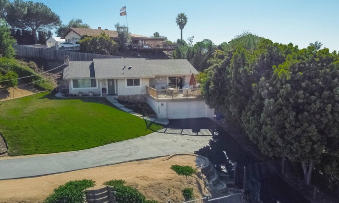 Sitting on a hilltop with gorgeous views overlooking Escondido and it's rolling hills this charming home has everything you will need for a San Diego vacation or work away! This home has it's own private gate to ensure maximum privacy, a large front lawn, citrus trees for guests to enjoy, a game room, a large outdoor deck with a gas fire pit, a fully-stocked kitchen and much more! The first bedroom features a queen sized bed and personal TV. The second bedroom has a king sized bed, en suite, and in-room TV.