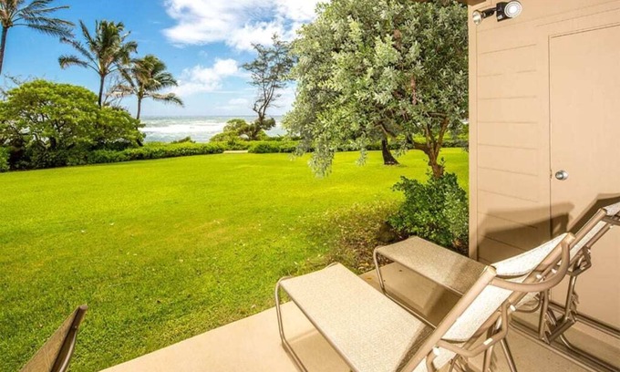 Castle Kaha Lani Resort #127 - This 739 sq. ft. vacation unit steps out into an expansive grassy lawn just steps from the ocean. Unit 127 features charming artwork and décor to add a bit of personality to your vacation accommodations. Take in Kauai’s beautiful sunrises from your private lanai before heading out to enjoy your day. Extra touches include ceiling fans, flat screen, and WiFi. Sleeps 2 in 1 King bed.