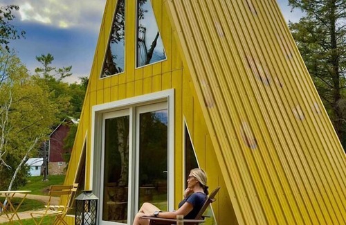 Celebrate Wisconsin’s cheese heritage in this award-winning, A-Frame cabin, shaped like a wedge of Swiss cheese! Enjoy a peaceful getaway on this idyllic sheep farm. Live simply, unplug and decompress. Wake to the sound of morning birdsong, sit under the stars by the firepit at night. Fish in the class II trout stream. Walk the trails in the woods. Cabin has no wifi, no water, and solar-powered electricity. Access to wifi service and your own private bathroom and kitchen is a short walk away. Guests have the cabin to themselves, they also have access to their own private bathroom and kitchen, located in the main farmhouse, a short walk away Most of the time I'll be around if needed. Best way to contact me is on the app. Schedules permitting, I am happy to give a farm tour to those who are interested or want to know more about how the farm is being run as a rewilding and regenerative operation. Property adjoins Blackhawk county park and is a 15 minute drive from Governor Dodge state park. Both parks great for hiking, biking, swimming, paddle boarding, cross country skiing and more. Cross country ski from the cabins back door directly out to Blackhawk trails. Local attractions: Taliesin, Spring Green, American Players Theatre, House on the Rock, Cave of the Mounds are all an easy drive from the farm. Close by the town of Mineral Point boasts charm and fun activities for all ages, with a bustling high street full of restaurants, cafes, art and pottery galleries. Farm also allows easy access to surrounding towns (Dodgeville, Highland, cobb, Linden etc) and is an hour from Madison. There is ample parking at the farm. We are in a remote location best accessed by car. There is no uber / lyft service in this area :) There is no electricity in the cabin, but there is a portable solar generator that can be used to charge phones, run a fan and / or heater etc. No internet is available in the cabin but a network is available in the kitchen area.