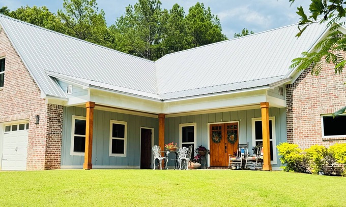 Beautiful chef’s kitchen for meals together at the island or dining room table, seating for up to 13. 4 at bar, 8-9 at table.Or enjoy the outdoor table under the pergola. 3 living spaces to spread out or snuggle up: Cozy living room-gas fireplace, smart tv w/ cable; Outdoor screened in porch-wood burning stove and cable tv; Loft w/ a trundle daybed and a tv perfect to hook up to gaming systems. Enjoy a cup of coffee on the front porch rocking chairs, or get your heart rate up with a hike through the woods or a jog down the 1/4 mile driveway. The primary suite includes a comfortable king bed, entrance to the screened in porch, a spacious shower, a large tub for a relaxing soak, double vanity, and private toilet room.A short 5 minute drive to the charming downtown of Water Valley for shopping, coffee shops and restaurants, 10 minutes to the famous town of Taylor, and 25 minutes to the heart of historic Oxford to take in the sights, catch a game at Ole Miss or reunite with friends!