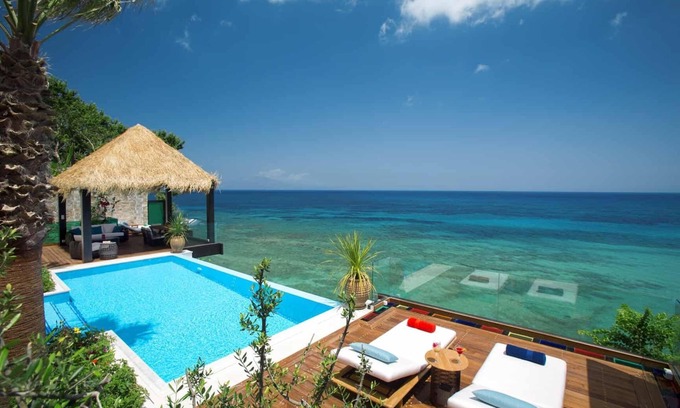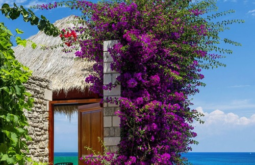 The beautiful 1-Bedroom Deluxe Spa Villa (85 m²), located on the beachfront, enjoys a private heated swimming pool and boasts exceptional views of the endless crystal blue Ionian Sea.