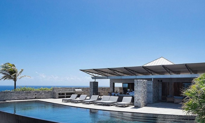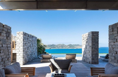 Serious leisure was the design focus in this stylish villa, while hand cut stone and dark wood create a natural backdrop to the deep levels of luxury. The swimming pool is a smooth mirrored curve before a 280-degree view taking in the sweep of Lorient Bay to St Jean.