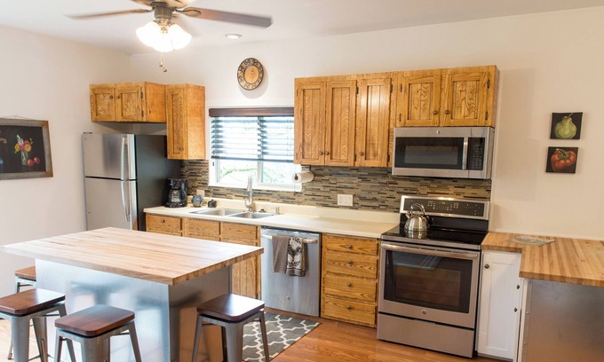 There is a newly remodeled fully equipped kitchen with large window and great view of the Oak Grove.