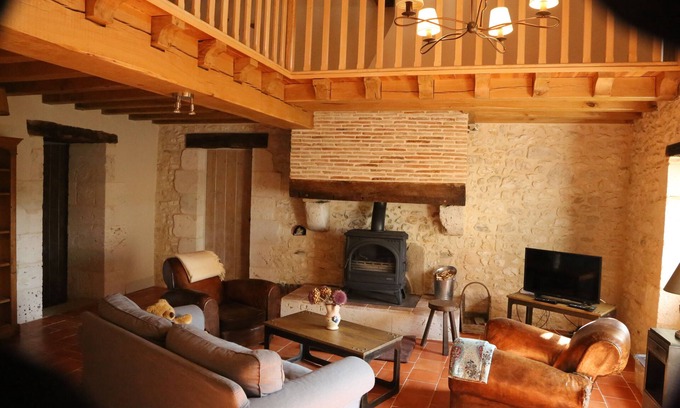 Fabulous 3 bedroom gite sleeping up to 6 in restored converted 200 year old winery, offering spacious modern comforts in a traditional French farmhouse setting. All original features have been retained, including oak beams, terracotta floors and thick stone walls. Wood burning stove and underfloor heating add to the atmospheric presence of this lovely warm family gite. Shared access to heated sunny pool in summer. Own private covered dining area overlooking garden.