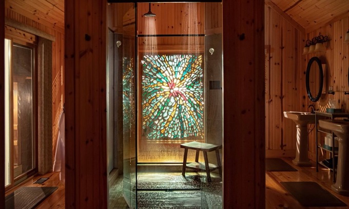 The spacious bedroom suite with dramatic woodland views includes king size sleigh bed with the most comfortable mattress you will ever sleep on and his and her closets. A 10' wide vaulted opening from the bedroom faces a dramatic 2-person shower in the center of the bathroom suite. An immense 6' x 6' custom glass shower features 2 high-volume rain-maker shower heads that hang from an 11 1/2' ceiling. The backdrop for this gorgeous shower is a Foltz inspired (renowned Ohio sculptor) 6' tall stained glass window. At night the window may be illuminated from the outside and is controlled with a dimmer switch located next to the bed.