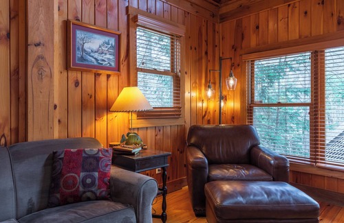 Of all of our luxury cabins, The Boat House offers the most rustic experience having originally been a pole barn. The Boat House has had many updates over the years and is now one of our most popular accommodations. Add-ons upon add-ons make this a one of a kind space. Lots of knotty pine, a copper sink in the large bathroom, railroad ties used for the fireplace mantle.....and that just scratches the surface! Go and see for yourself! Fish from the johnboat, sit by the fire pit, and take in the wooded views from each window