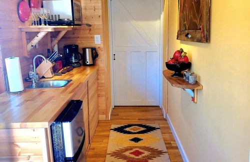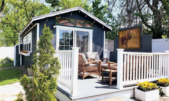 This beautifully designed one-bedroom cottage features vaulted ceilings and a rustic pine interior that exudes a "northwoods" flair, created by talented local artist and owner Vincent. Enjoy the warmth of your own private wooded yard complete with a firepit, perfect for evening gatherings under the stars. The guest house also showcases several of Vincent’s paintings and bespoke furniture, adding a unique touch that enhances your stay. Just steps away from the vibrancy of downtown, you can explore local shops, savor delectable cuisine, or unwind at a café—all within easy reach.