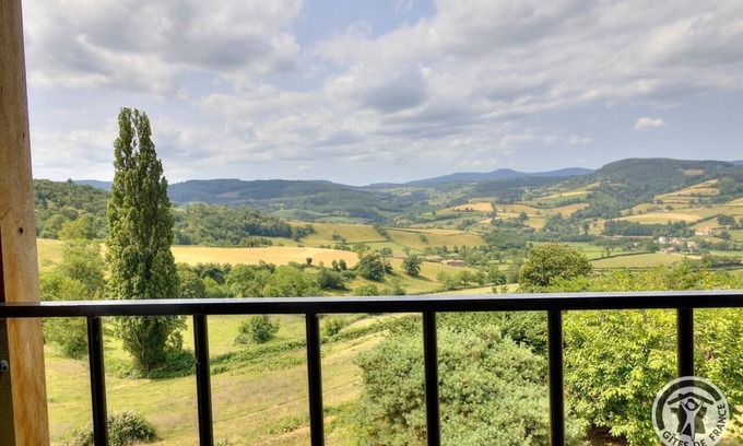 Block of 4 chalets in a peaceful, leafy spot with lovely views of the hilly countryside. Unspoilt setting far from the city bustle, ideal for having a restful holiday. Nearby : hiking & mountain biking trails (the village is crossed by the track 'Compostelle-Cluny-Le puy en Velay'), leisure area (play area for children, boules area, table tennis), inn (takeaway food). Detached wooden chalet set in a meadow including 4 identical buildings. Accessed via terrace (wooden stairs) or practically single level access (1 step) via kitchen on the other side. Ground floor : living room (double sofa bed), kitchen, WC. 1st floor : 2 bedrooms (double bed, balcony), (2 single bunks), bathroom. TV point. Bed linen not supplied (no renting possibility too). Large meadow. Parking. Barbecue is not allowed on-site (a fixed one is available in the leisure area). Close to the village hall and a public campsite (6 pitches). Ideal for groups, seminars, courses. Disc golf : 5km. Adventure Park (outdoor activities sports) : 10 km. Zoo : 20 km.