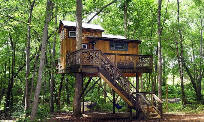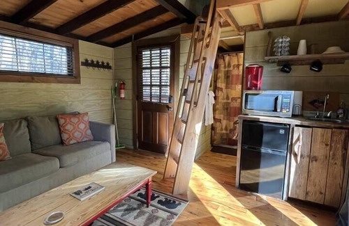The "Miss Molly" treehouse has been the subject of many discussions as possibly the best treehouse in the Carolina's. Its a roomy 220 sq. ft and features a queen bed in the loft, Heat/Ac, Shower, Toilet, TV and DVD player. It has a very comfortable nook where you can enjoy the TV, a good book, or even take a short nap. The large deck offers a great view over the property and has two rocking chairs as well as a bistro table for eating at.