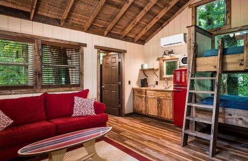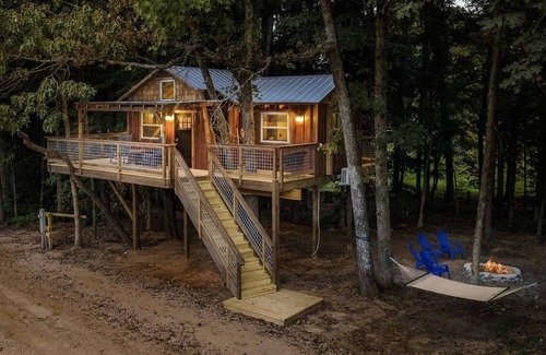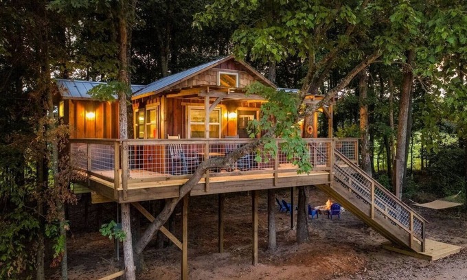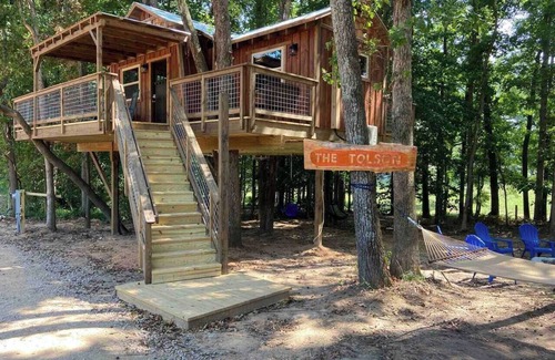 Welcome to "The Tolson". This is a special treehouse that sleeps up to 6 guests. It features a queen bedroom, set of bunk beds and a sofa couch in the main room. At 400 square feet it has plenty of room to move about and has a huge front deck wrapping around the sides. Nestled along the East treeline of the farm, The Tolson provides shade most of the day but has a great view of the sun rising and setting. This house also has its own swings and fire pit to complete your experience.