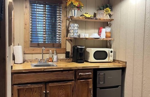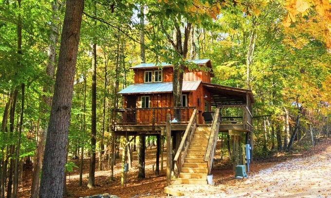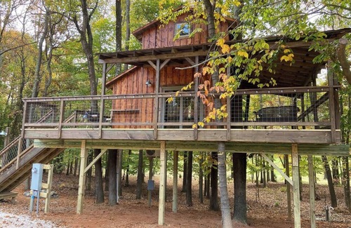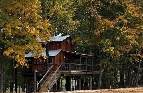 Welcome to "Traci’s Treasure". This is a special treehouse that sleeps up to 4 guests. It features a queen bedroom in the loft as well as a pullout queen sofa sleeper. At close to 400 square feet, it has plenty of room to move about and has a huge front deck wrapping around the sides. Nestled along the East treeline of the farm, Traci’s Treasure provides shade most of the day but has a great view of the sun setting. This house also has its own swings and fire pit to complete your experience.