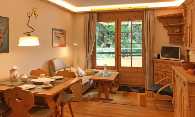 "Chesa Alvetern 5", 1-room apartment 35 m2 on 1st floor. Partly renovated in 2016, comfortable and wooden furniture furnishings: living/sleeping room with 1 double bed (2 x 80 cm, length 200 cm), dining nook and TV (flat screen). Exit to the balcony, south facing position. Open kitchen in the entrance (4 hot plates, oven, dishwasher, toaster, kettle, microwave, electric coffee machine, Capsules for coffee machine (Nespresso) extra, fondue Set (cheese)). Bath/WC. Heating. Balcony. Balcony furniture. Partial view of the resort. Facilities: hair dryer. Internet (WiFi, free). Garage space n 5, height 200 cm, width 250 cm. Please note: non-smokers only. Maximum 1 pet/ dog allowed.