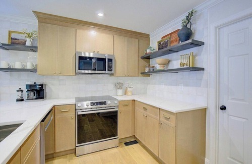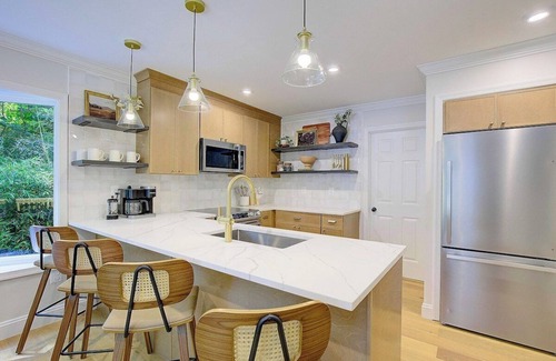 Enjoy cooking meals in the full kitchen with everything you will need to prepare and share meals at home. The kitchen is stocked with everything from plates and glasses to cookware, serving dishes, utensils, toaster, blender. Nothing has been overlooked!