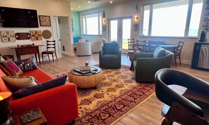 This custom home was created and built by artists so when NOT watching the never-ending array of eagles, herons, ducks, nesting ospreys, songbirds, dragonflies, and everything that floats, go by; from jet skis, crab boats, sailboats, to giant freighters and cruise ships traveling the deep-water channel…there’s endless interest & beauty all around. Open floorplan provides amazing views from every room, every seat. Large, well appointed, open, airy kitchen is ready to make all your meals memorable. Dine stylishly at the mid-century-modern Danish table or sit high and comfy at the custom designed butcherblock peninsula, originally from the Old Faithful Inn kitchen, Yellowstone National Park. Kitchen sink is, itself, a treat; a Ruvati 45” long, stainless steel Wonder Station of prep, serve, buffet, clean-up cheffing fun. Soft natural light pours in from 3 enchanting rooftop eyebrow windows, sunset reflects thousands of brilliant sparkles against the hand-laid ironstone wall in the living area. Main living area has 2 Queen sleeper sofas, one in a cozy alcove easily doubles as a dedicated office space with tilt-top coffee table for laptop, and office supplies. (If you must work, you can leave things set up to take a ‘bay break’.) Two private bedrooms each with king beds, smart TV’s, private en suite bathrooms, and inviting bay window seats for private moments reading or just watching the water. There is a 3rd full bath which services the main house located just past the well-stocked library nook where you’ll find games, puzzles, cards, and books for kids to adults.