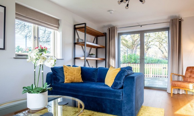 From the kitchen, there is a door into the living room, which is a light and airy space with windows on two sides and double doors out to the private patio. Bright pops of colour come from the two velvet sofas, one cobalt blue, the other moss green and a honey-hued rug covering the wooden floor. There's further seating with a mid-century leather chair set by the patio doors. Industrial style shelving highlights the rural, yet modern feel as does the stylish wall mirror, lighting, circular glass coffee table and wooden TV unit which houses the smart TV.