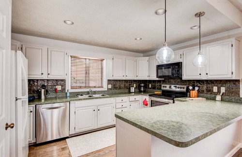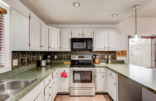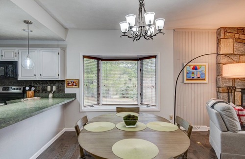 After descending one short level from your designated parking, you will find a spacious two bedroom, two bath condo with large sliding glass doors that allow plenty of light into the main room. It has been newly updated with fresh decor and furnishings. The living room has ample seating with a leather reclining couch, two cozy swivel chairs, gas log fireplace, flat screen smart TV, and Wi-Fi. The kitchen is fully equipped with everything you'll need to prepare a meal, and the dining area looks out through the big bay window to the peaceful yard beside the unit. There's a sunroom off the living room that doubles as an office for digital nomads, equipped with a desk and two monitors for guests to hook their computer into.