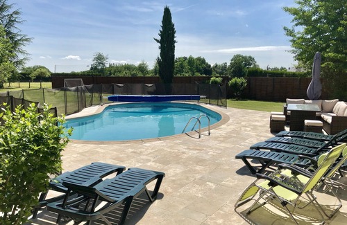 • Directly behind the property, the patio and pool area are South-facing and the lawned area is probably the size of half a football or rugby pitch, so plenty of space to run around.