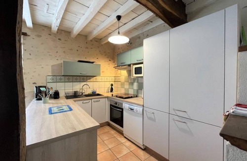 In the heart of the Jurançon vineyards, with the Pyrenees in the background, 15 minutes from Pau. Gîte set up in an old restored barn (pebbles and beams preserved) near the owners' farm. Ground floor: kitchen (ceramic hob, electric oven, dishwasher, washing machine, microwave, fridge-freezer, Senseo coffee maker), lounge area (TV, wood stove, WIFI/fiber), WC. Upstairs: 3 attic bedrooms (1 bed 160, 1 bed 140. 2 beds 90), shower room (Italian shower, 1 sink). Separate WC. Electric heating and wood at an additional cost. Beds made for your arrival included. Towels available for rent. Enclosed grounds, pleasant terrace under electric awning, garden furniture, barbecue. Hiking trails from the gîte.