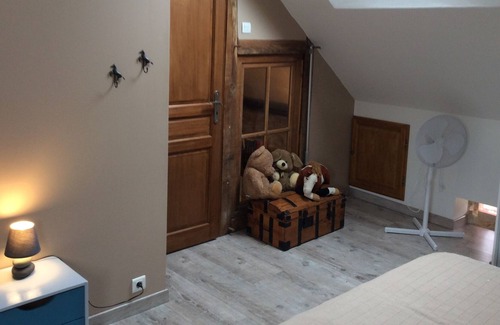 Stone house, the 30m2 common room has a magnificent oak staircase, beams and a Burgundy stone fireplace. The kitchen is small but very practical and has a very nice south orientation. The room is spacious and is attic with the ensuite bathroom.