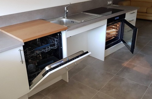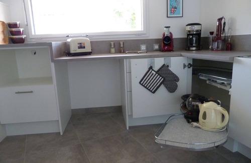 Next to "Chez Gustine", our first gîte with swimming pool, "Chez Marcel" is a fully equipped PRM (Person with Reduced Mobility) house; can also be used by non-disabled people. Located in the village, but set back, with a view of a large garden (5000 m2). Near the Chênes de La Marne park, with PRM trail, children's games and fishing without a license. 10 km from the Breton marshes; 30 km from the sea, Pornic, Préfailles, Noirmoutier. Single storey house, in the suburbs of Nantes, comfortable 83 m², in the countryside. Fitted kitchen with specific oven, induction hob, dishwasher, washing machine, dryer, microwave, fridge, freezer, living room TV possibility, 1 bedroom with bunk bed 140 at the bottom and 90 at the top, 1 adapted bedroom with 140 mechanically adjustable bed, sheets and towels provided, bathroom with shower and appropriate WC, very large furnished terrace, garden furniture, barbecue, compliant private parking space, BB bed and accessories on request, underfloor heating by heat pump (heat pump). (For the swimming pool, ask the tenants of "Gustine" for the possibility of borrowing it, between well-mannered people generally no problem)