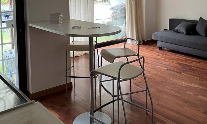 4 people. Not too far from the city centre, equipped with a sauna inside the principal bedroom, and of course, all the amenities a living room may need (washing machine, cooker, sofa bed, outdoor area with table and loungers). Accessible via a quiet green park, close to the hospital area. Suitable for all kinds of stays, whether for work or leisure.
