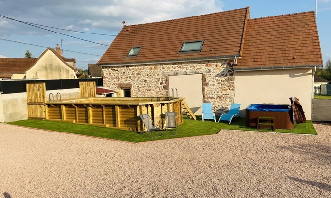Authentic 19th century country farmhouse, fully restored & revamped, nestled in the heart of a peaceful little rural hamlet steeped in history (a former wine-growing village surrounded by 230 ha of vines at the start of the 20th century) nestled at the foot of a wooded hill on the edge of meadows and groves, on the banks of the Loire, the last "wild river" in Europe. Pleasant rural setting in the hollow of a preserved natural site classified as a "Natura 2000 Zone" for the quality of its exceptional plant & animal biotope (fish, mammals, birds, insects, amphibians ...), axis of migration, reproduction and nesting for many many species, some of which are very rare (Atlantic salmon, large Shad, sea lamprey or eel; waders, kingfisher, bank swallow, European bee-eater, etc.). Small paradise for any nature lover. Spacious gîte with good comfort. Warm country character combining traditions & modernity. Lovely exotic atmosphere of an old country house retaining many traces of the past (beams, French ceilings, original floor tiles). Large exposed and shaded terrace opening onto a large enclosed & flowered courtyard of 400m² (perfect natural pétanque ground!) Sheltering a pleasant little garden, a fun "mini vegetable garden" for free picking, an outdoor spa and a beautiful above-ground swimming pool (4x6.5m). Composition: Terraced village house adjoining 2 other lodgings on a family property (total independence without vis-à-vis). Wireless. Oil central heating. Ground floor: kitchen, living room, bathroom (shower), separate toilet. 1st floor: 3 bedrooms, 2 of which are in a row (bed 2 p. 140x190cm / 2 beds 1 p. 90x190cm / bed 2 p. 140x190cm + sofa bed 2 p. 140x190cm as an extra). Terrace + above-ground swimming pool (4x6.5m) + outdoor spa + enclosed courtyard with small garden + garage (1 space) + bicycle room + private parking. Shops & services 5 km. Station 5 km. Creusot TGV station 62 km. 104m² on the ground (areas under sloping ceilings included).