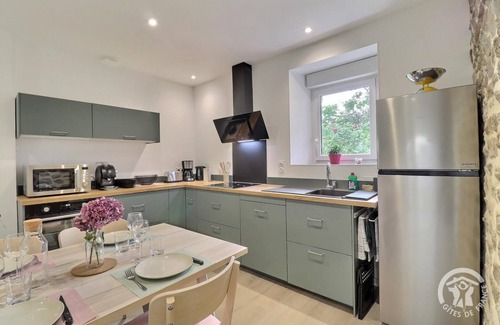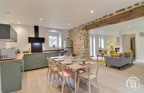 This independent cottage is organized on 2 levels. On the ground floor: - a living room with fitted kitchen (filter and pod coffee makers available), dining table, lounge - a bedroom with a 160 x 200 cm bed (with interior window overlooking the living room) - a bathroom with shower - a separate toilet - a laundry room On the 1st floor: - a bedroom with a 90 x 190 cm bed - a bedroom with a 140 x 190 cm bed - a bedroom with 2 90 x 190 cm beds (adjustable) - a bathroom with shower and toilet For your comfort, sheets are provided and beds made on arrival. Baby equipment includes: bed, high chair, bathtub, changing mat. Outside: - an interior courtyard with gate for parking vehicles - a garage - a secure room for storing sports equipment or bicycles - two terraces, one on the north side and one on the south side - a garden furniture with parasol and barbecue - 1600 m² of wooded land with plants and fruit trees A cozy atmosphere for this charming stone house, independent and located near the owners' home. Tastefully restored, it will seduce you with its warm living room: on one side, a welcoming kitchen with dining table and wood stove and on the other a nicely decorated living room with several relaxation areas. Outside, from the private terrace on the south side, you have a breathtaking view of the surrounding countryside. The whole is bordered by a 1600 m² flowered and wooded garden with swing, trampoline and shuffleboard. Want to get some fresh air? 2.4 km away, the Couesnon Valley leisure center promises you great sporting adventures in the great outdoors (kayaking, climbing, paddle, archery, orienteering) and 3 km away, the GR39 awaits you! Discover the City of Art and History of Fougères and visit its majestic medieval castle 21 km away or stroll through the botanical park of Haute-Bretagne 28 km away.