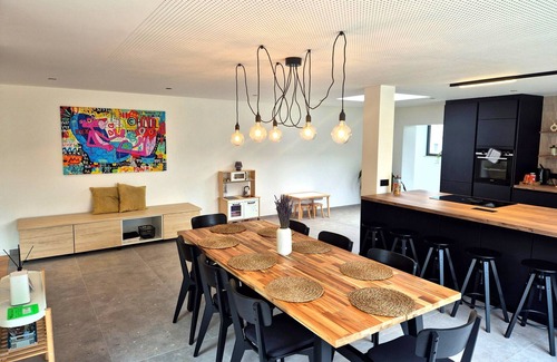 • Cœur de la maison : la cuisine et la salle à manger Notre cuisine entièrement équipée vous invite à exprimer votre talent culinaire. Préparez de délicieux repas en famille ou entre amis et profitez d'un apéritif convivial autour de l'îlot central. La grande table de la salle à manger peut accueillir jusqu'à 8 personnes.