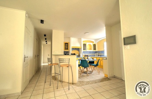 Large house totally detached, in peaceful countryside setting, about 30 km from Lyon and 6 km from St Martin en Haut, a lively village in the Monts du Lyonnais area. It has 6 bedrooms, an enclosed garden and a private swimming-pool. On the 1st level (step-free access) : large living room (dining area, lounge area, open equipped kitchen area). Hall. 4 bedrooms (3 bedrooms with double bed in each, 1 bedroom with 2 single beds). Bathroom (bath + shower + double washbasin). Separate Wc. Storage room. On the lower floor (step-free access from outside) : large playroom (pool table, shuffleboard). 2 blind bedrooms (1 bedroom with double bed wooden cot, 1 bedroom with 2 single beds). Shower room (shower, double washbasin, indoor bike, elliptical cross trainer). Wc (with hand basin). Laundry room (washing machine). Storage room leading to the garage (the garage doesn't enable to park vehicles). Household linen supplied. Bed linen supplied at extra cost (10 euros for a double bed, 7 euros for a single bed). Towels not supplied. Final cleaning included in rent. Outdoors : 3 terraces (1 is covered and has garden furniture), large enclosed garden with grassy play area (swings), boules court, courtyard, covered and heated swimming-pool (9.3 m x 4 m x depth 1.4 m) available from May 15th to September 30th. Stone-built barbecue (charcoal). Parking on the property. Lac du Ronzey (in Yzeron) & Mini train des Monts du Lyonnais 7 km away, Salva Terra (Medieval leisure park) 16 km, Zoo of Courzieu (raptors & wolves) 17 km.