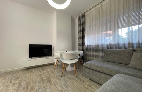 This modern, newly renovated one-bedroom apartment is perfect for a couple or up to three guests. It features a cozy kitchenette, a washing machine, and a small balcony, providing everything you need for a comfortable stay.