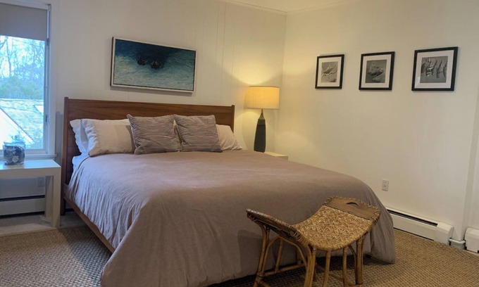 Stunning location on 8 waterfront acres at Dering Harbor Inn. Newly refurbished condo with peaceful private deck overlooking the harbor and boats. Big bedroom and en suite bathroom with shower and tub. Fully functional retro kitchen. Saltwater pool. 2 free parking spots. WiFi. TV. AC. Tennis and large gym also available to rent. 5 minutes walk to harbor, Marie Eiffel market, liquor store, and bike rental.