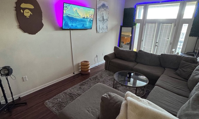 Located in Atlanta, this welcoming apartment is designed for 4 overnight guests, but it’s spacious enough to host gatherings of up to 15 people. Guests can unwind in the bathtub-equipped bathroom or break a sweat in the fitness room or even take a relaxing break on the balcony with a Great view of the city skyline. With ambient lights filling the house, AC, heating, and WiFi, your stay will be nothing short of enjoyable. Fall in love with Atlanta and enjoy the magic it has to offer.