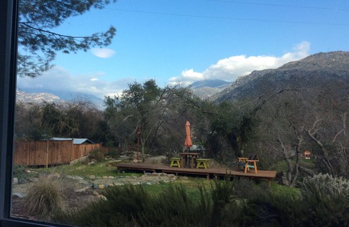 The main house opens into a brilliant living room featuring floor to ceiling windows showcasing the Sierra Nevada mountains. You'll find lots of comfy seating, a woodstove, large screen smart TV and amazing local artwork adorning the walls. The open floor plan includes a dining table that will seat six and a full kitchen complete with a gas oven & stovetop, new refrigerator/freezer, microwave, Keurig coffee maker, blender, cookware, dinnerware...you name it. The bedroom contains a brand new Cal King bed, large mirrored closet and a view of the garden and mountain peaks of Sequoia National Park. The bathroom features a wonderful claw foot bathtub with shower curtain enclosure, mirrored vanity, plenty of room, and towel sets for everyone. The temperature of the house can easily be controlled by a Nest thermostat. No matter how hot or cold it is outside, you will be very comfortable inside.