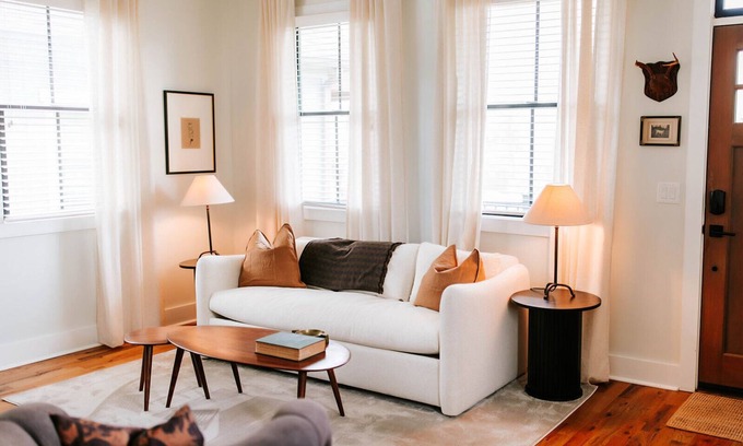 Your stay at the cabin includes an array of luxurious amenities designed for comfort and relaxation. Enjoy two spacious bedrooms featuring organic cotton luxury linens, with one offering a king-sized bed and the other hosting two twin beds, perfect for accommodating friends or family. Indulge in the full kitchen equipped with modern stainless steel appliances, gather around the cozy living room complete with a 55" flat-screen TV, or unwind on the spacious back porch with a fire table. Additional features like a washer/dryer, complimentary parking, and access to community amenities such as a gym and outdoor activities ensure your stay is both convenient and enjoyable.