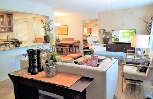 Your stay includes access to a chef's kitchen equipped with top-of-the-line appliances, ideal for preparing delicious meals for your bridal party. The open layout seamlessly connects the living spaces, making it easy to socialize and enjoy each other's company. Relax by the private outdoor in-ground pool surrounded by lush landscaping and mood lighting, creating an enchanting ambiance for those special moments. With four well-appointed bedrooms and a den easily convertible into additional sleeping space, you’ll find comfort for up to ten guests, ensuring everyone feels at home while also maintaining privacy.