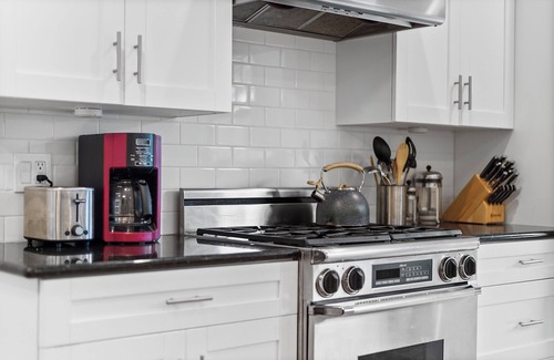 The modern kitchen is fully equipped with high-end appliances, including a gas stove, wine chiller, refrigerator with filtered water, and a dishwasher. Coffee lovers will enjoy the coffee machine, drip maker, and tea kettle. A sleek dining area comfortably seats 4 guests, ideal for both intimate meals and morning coffee sessions.