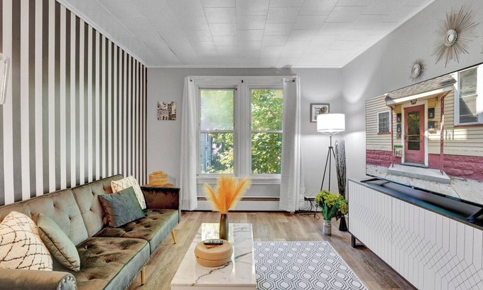Step into this stylish Rochester home and be greeted by modern decor and cozy vibes. The living room boasts a comfy sofa bed perfect for lounging and relaxing after a long day. The kitchen is fully equipped and making cooking a breeze. The bedroom offers a tranquil retreat with a comfy bed and soft linen. The bathroom will also have everything you need to make your morning or evening routine a relaxing experience. With its convenient location this apartment is the ideal home away from home. The home is very centralized and equally distant to Lake Ontario beach and downtown Rochester.