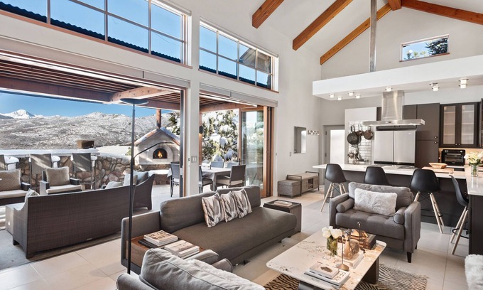 Best-rates for the Chic, Contemporary Mountain Statement starts from $1,058 per night with includes Pool, TV, Bedding/Linens, Child Friendly, Internet, Balcony/Terrace, Sports/Activities, Spa, Guest Services, Barbecue/Outdoor Cooking, Security/Safety, Fireplace/Heating, Hot Tub, Kitchen, Wellness Facilities, Laundry, Parking with all other amenities. Perfect for Weddings is committed to ensuring every guest experiences a comfortable and extraordinary stay, whether planning a romantic getaway, a honeymoon, a pet-friendly stay, or celebrating with the entire wedding party.