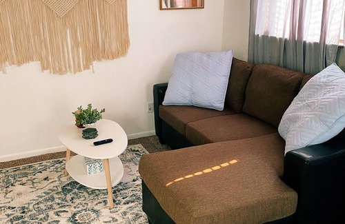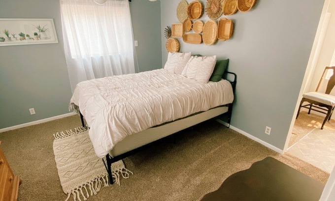 Peaceful & fashionable guest house. Self-contained with 1 Queen Bed, walk-in shower, washer/dryer, closet space, full kitchen with refrigerator, oven/stove, microwave, dining table, & living room with a 50" TV. It is a short drive to all of your adventures, & very close to the airport.