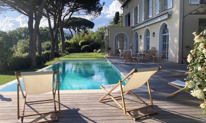 In Grasse, the world capital of perfumes on the Côte d'Azur, the villa is located in the Provençal countryside with a view of the hills and very close to amenities and quality shops. A haven of peace, serenity, calm under the series of elegant umbrella pines, at the edge of the infinity pool to meet up with family or friends of up to 12 people. Here we reconnect with the charm of staying in the bastide, a comfortable country mansion, with its large adjoining rooms, its tasseled chandeliers, its Burgundy stone floor, high ceilings and the delicate elegance of its doors and woodwork. Rattan armchairs on the terrace, deck chairs on the lawns or at the edge of the swimming pool according to the course of the sun, the play of shadow and light, the moment of the day or the night, at the stroke of noon or the starry sky...