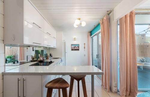 The bungalow was renovated with its midcentury history as inspiration. It features floor to ceiling sliding glass doors, tile floors throughout, sleek and minimalist kitchen cabinets, and a 260 sq foot patio. The condo has a full kitchen (cooktop - FYI no oven!), dishwasher, washer/dryer and BBQ. The bed is King Size and very comfy! The location of the property is within walking distance of shopping and restaurants. Come and enjoy all that South Palm Springs has to offer!