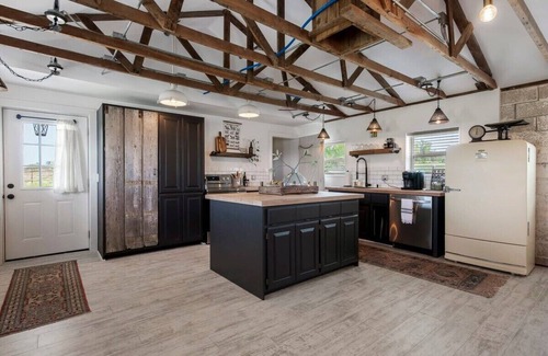 The Milkbarn provides a spacious layout, accommodating up to 4 guests in a harmonious blend of vintage aesthetics and contemporary amenities. Its well-lit interiors showcase a warm, welcoming ambience, accentuated by unique features like the farmhouse sink and vintage refrigerator, initiated with modern touches for a comfortable stay.