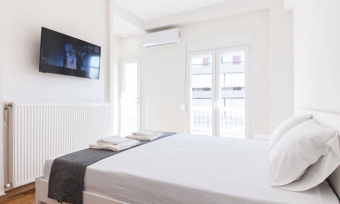 The focal point is a comfortable double bed, dressed in fine linens, ensuring restful sleep. The apartment is equipped with air conditioning to keep you cool during the warm Athenian days and wireless internet for all your online needs, whether it's streaming on the TV or staying connected with friends and family.