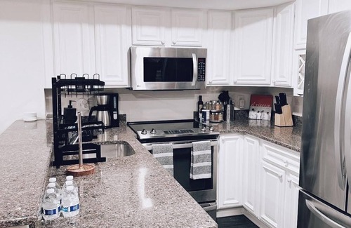 The fully equipped kitchen includes all the essentials for your convenience: cookware, silverware, a microwave, full-sized refrigerator, and coffee maker. Perfect for preparing quick breakfasts, light meals, or post-exercise snacks.